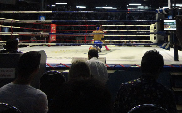 Bangkok é um bom lugar pra assistir o espetáculo deles. Existem dois grandes ginásios: o Lumpinee Boxing Stadium e o Ratchadamnoen Boxing Stadium. Fomos aconselhados a ir ao Lumpinee, pois no dia teria disputa de cinturão. E estava lotado! Os tailandeses fazem da luta uma grande festa.