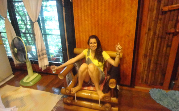 Os quartos têm estilo bangalô, todos de madeira, inclusive a parte do banheiro. Não tem ar condicionado, mas o ventilador foi suficiente. Fica em um morro, então você consegue ver o mar. Ficamos no quarto mediano e pagamos 2.400 bahts (R$240) por duas noites. Há bangalôs mais simples e outros mais sofisticados.