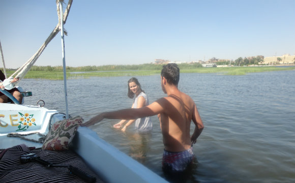 Tem também o passeio de Feluca pelo Rio Nilo. A Feluca é um barco a vela e pagamos 170 libras egipcias (U$ 21) cada um. Olha, dá pra pagar mais barato, mas como fechamos o passeio com o guia, tomamos esse chute aí. Dura apenas 2h30 e se você quiser pode almoçar no barco também. O bom do passeio mesmo foi poder mergulhar no Nilo, uma sensação muito boa. Água fresca, limpa e doce. Ainda passamos pela Ilha da Banana pra conhecer. Nada demais, mas fazia parte do passeio.