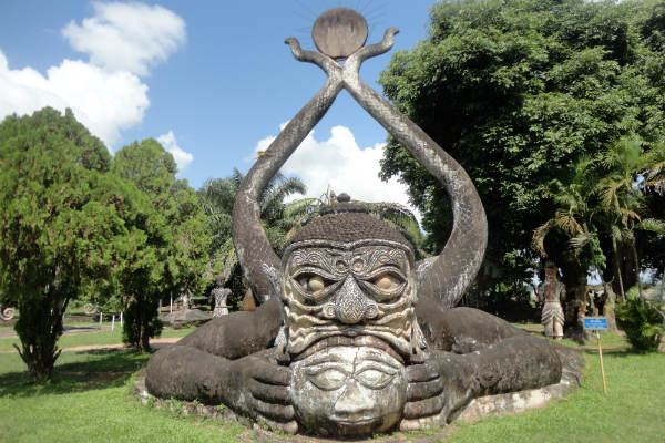 Vientiane não tem muito o que fazer, não. O único passeio turístico que fizemos foi conhecer o Buddha Park, um lugar meio que em ruínas cheio de estátuas que homenageiam o budismo. Não sei qual é a história do parque, mas tem umas esculturas bem bonitas por lá. Vale a visita. Pra chegar lá bastar pegar um busão na estação de ônibus. É só perguntar lá que eles informam qual é o número. Custa só 10 mil kips (U$ 1,25) para entrar no parque.
